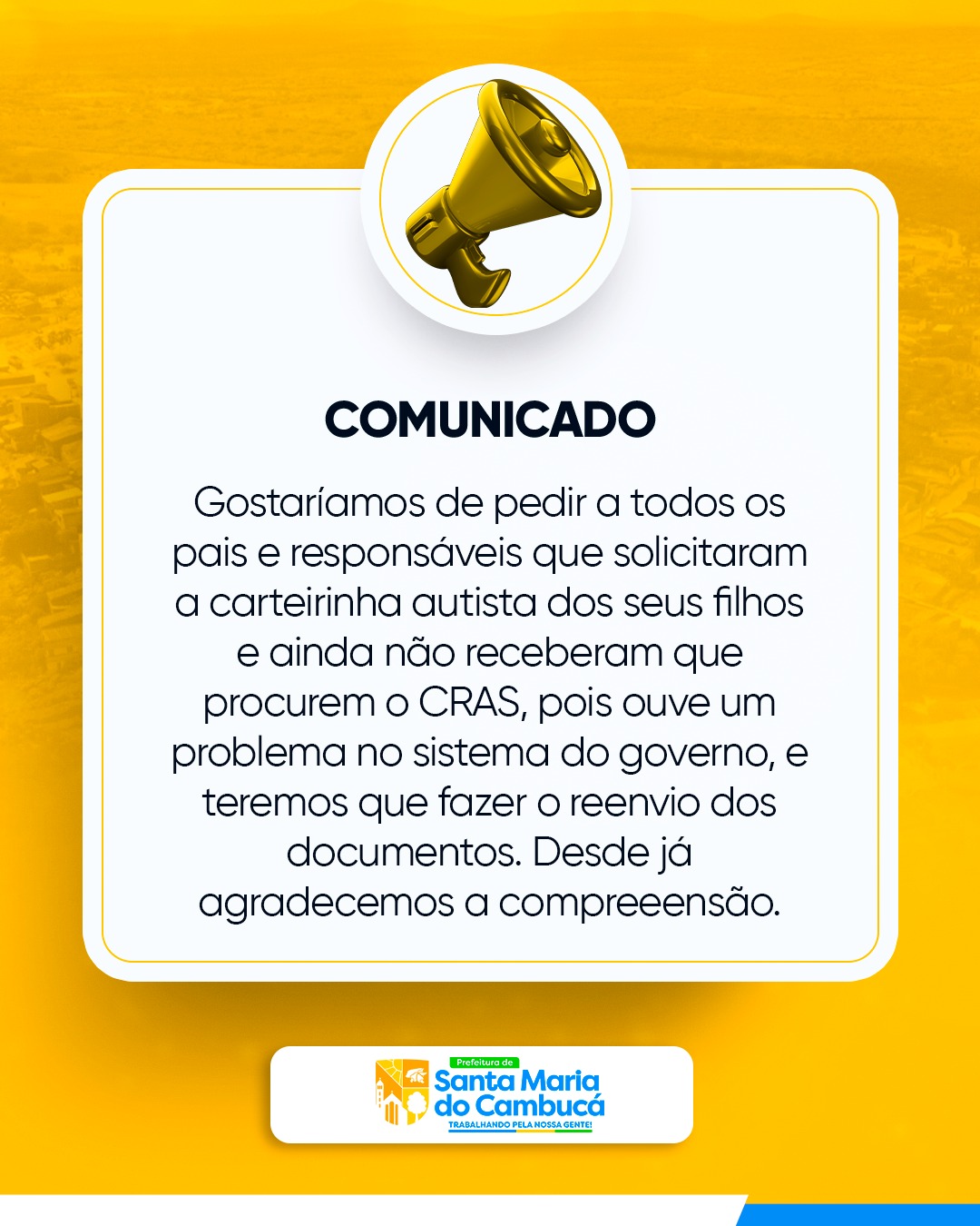 “Fique de Olho: Se já solicitou e ainda não recebeu a carteirinha de Autista, procure o CRAS!”